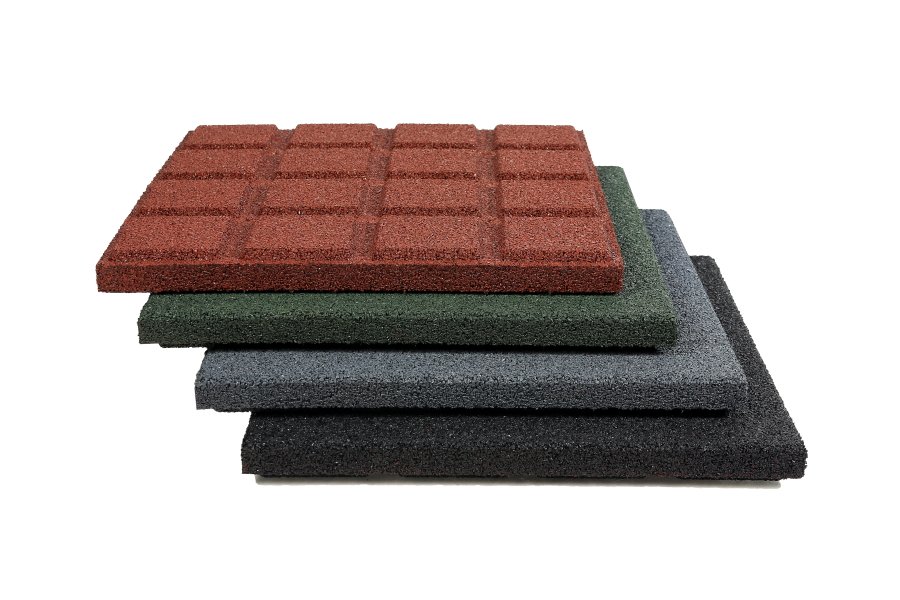 Rubber tiles are produced with a flat bottom, which can be glued to a flat (e.g. concrete) base, or with a ribbed bottom that can be installed on sand or similar, slightly uneven, surfaces. The tiles can be used in children’s playgrounds, non-professional sports playgrounds, terraces, sidewalks around pools, in gardens, and in gyms, both indoors and outdoors. Plastic connection joints are included.